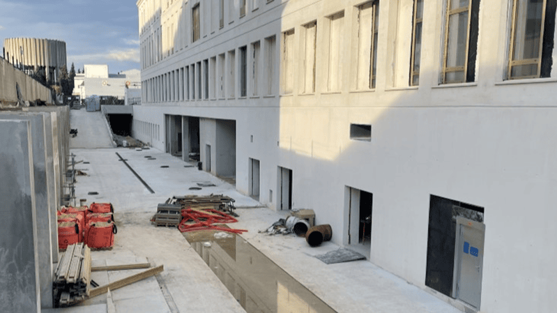 Le chantier progresse. Le dallage du sous-sol -2 et la dalle du sous-sol -1 sont réalisés à 80%. Les murs du 1er sous-sol sont en cours d’installation, de même que les poteaux qui supporteront les poutres et la dalle du rez-de-Jardin, ainsi que les cages d’ascenseur et d’escalier. Les volées d’escalier du 1er sous-sol sont mises en place. Les poutres supports des patios intérieurs du bâtiment sont en construction, le coffrage de la dalle du rez-de-Jardin a commencé.
