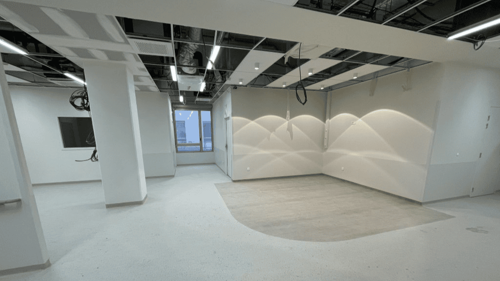 Les installations techniques (plomberie, électricité,climatisation) ont commencé à être déployées au rez-de-jardin. À cet étage, le cloisonnement a également débuté.